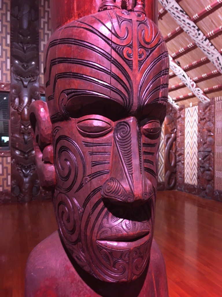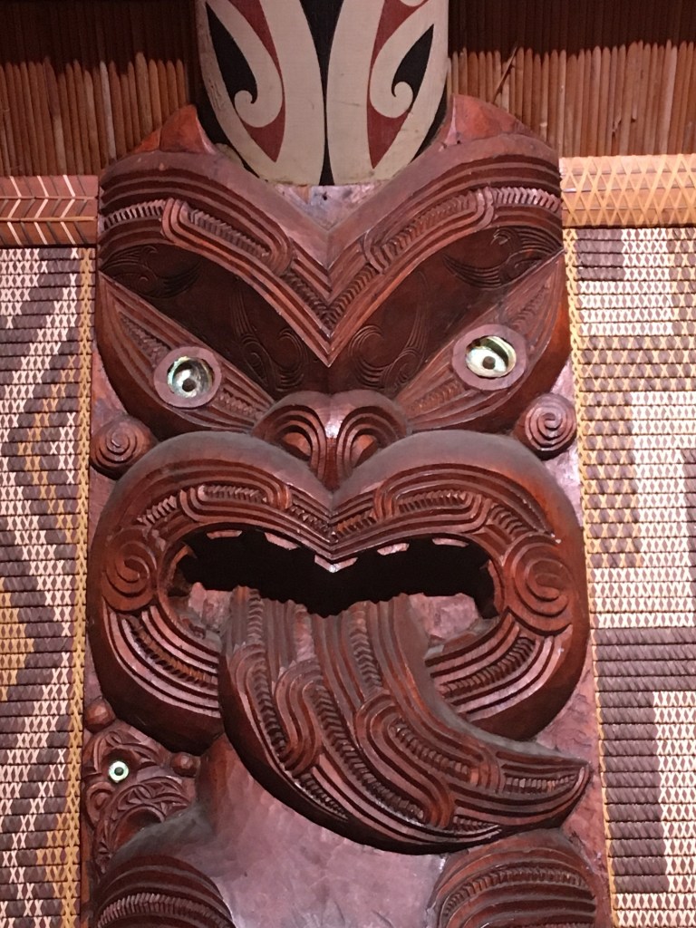 Before we left the house, we heard beautiful singing coming up the hill from the local marae, the meeting house of the Maori tribe in this area. I walked down there to get closer to the sounds but not enter. There were about 15-20 young men who were practicing the haka (war dance) so I stood and looked out to the bay to listen to the song, challenge and response: