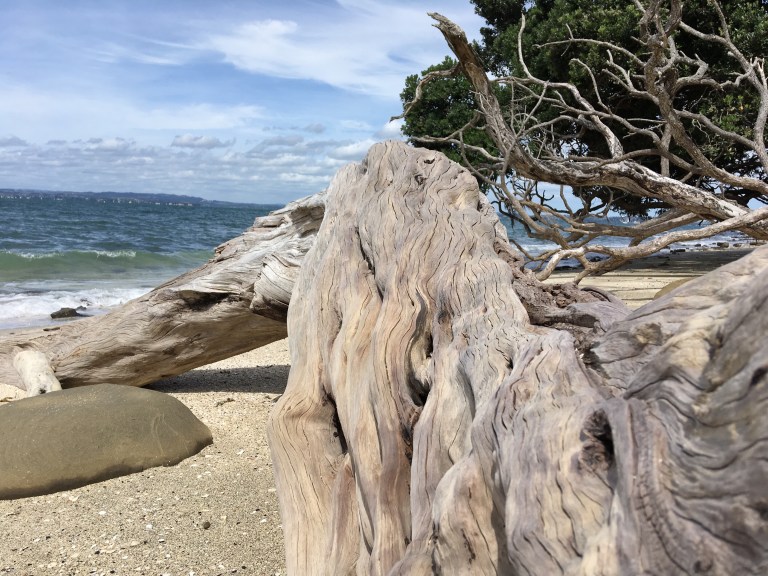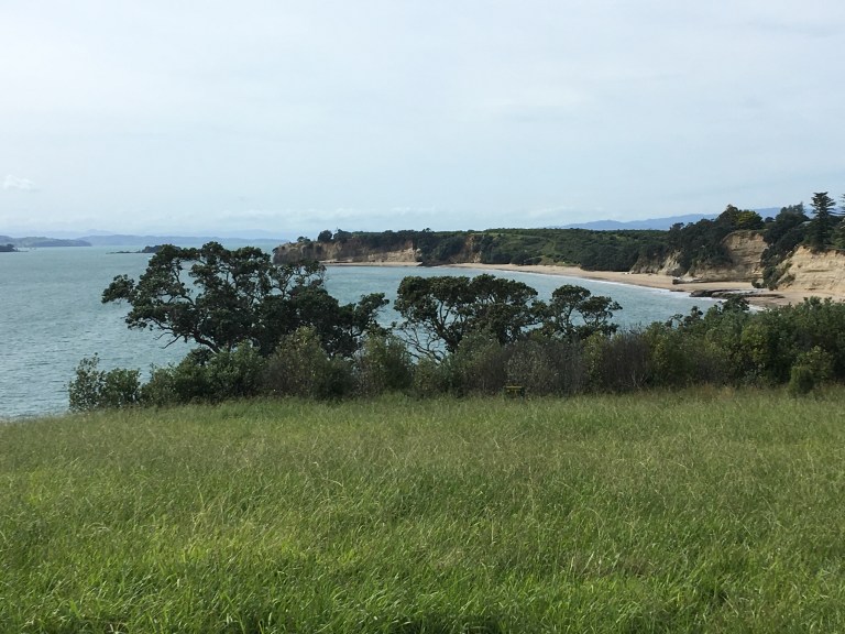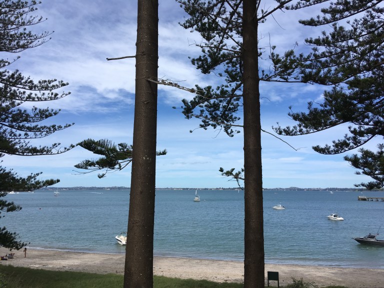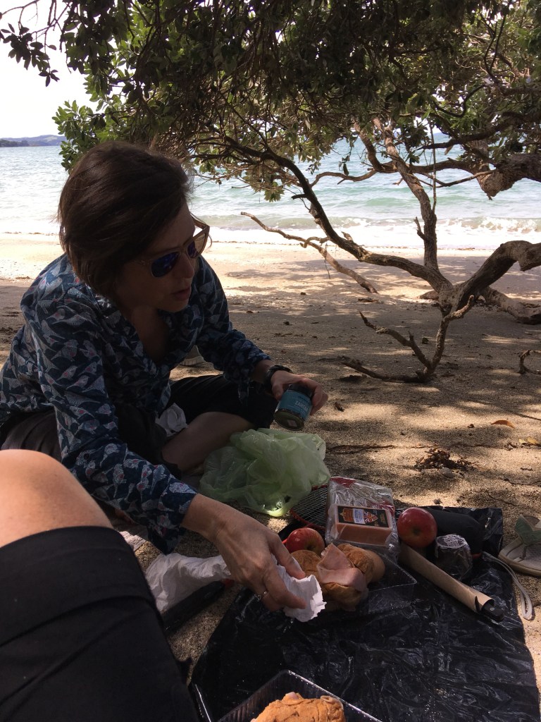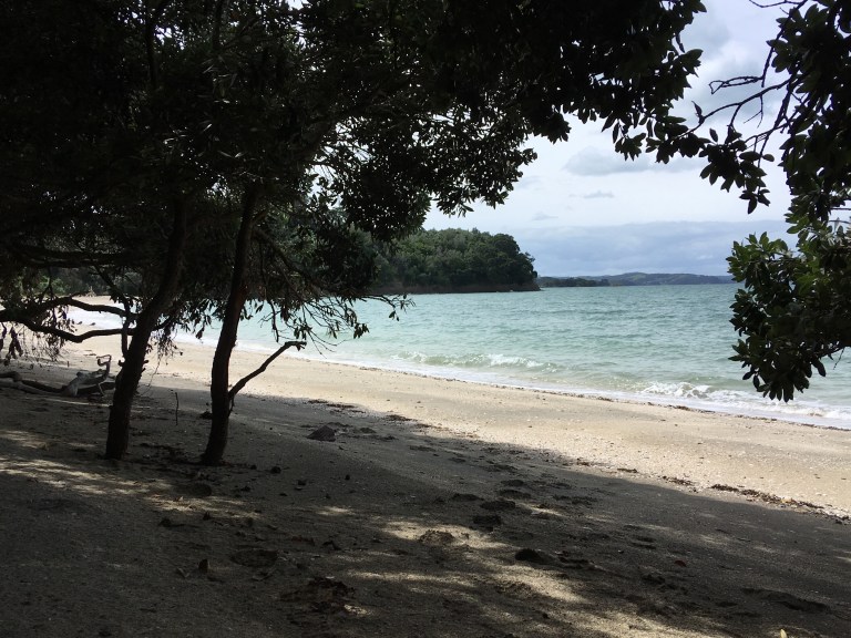 Since we brought a picnic with us, we decided to hike around the island a bit and find a nice spot for lunch. We took a trail that led to Calypso Bay…just 600 meters and then another 600 meters (oh, this sounds familiar!). It was well worth however many 600 meters there were because we ended up having our own private South Pacific beach. It felt almost like a movie set, so isolated, yet Auckland is visible across the water.