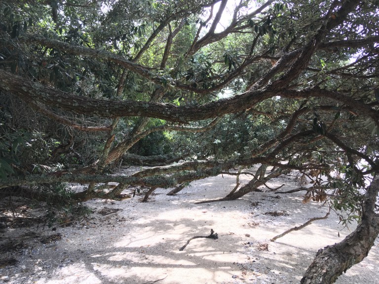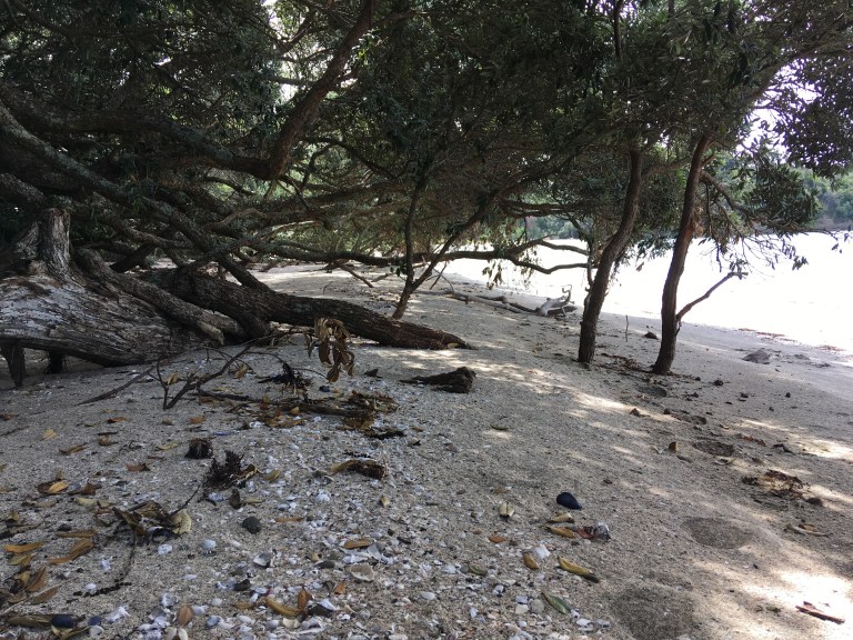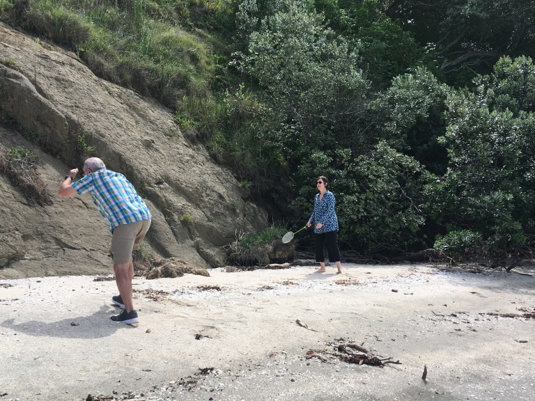 We finished up lunch and play and walked back to another part of the island where there’s more forest (bush) to look for birds. Michael and Johanna had been here about four years ago and spotted a Kiwi mom and chick (highly unusual for a daytime sighting) so we were hoping for some bird sightings of any kind. We saw some fan tails and saddlebacks, no kiwis. But the sounds in this wooded area were so amazing.