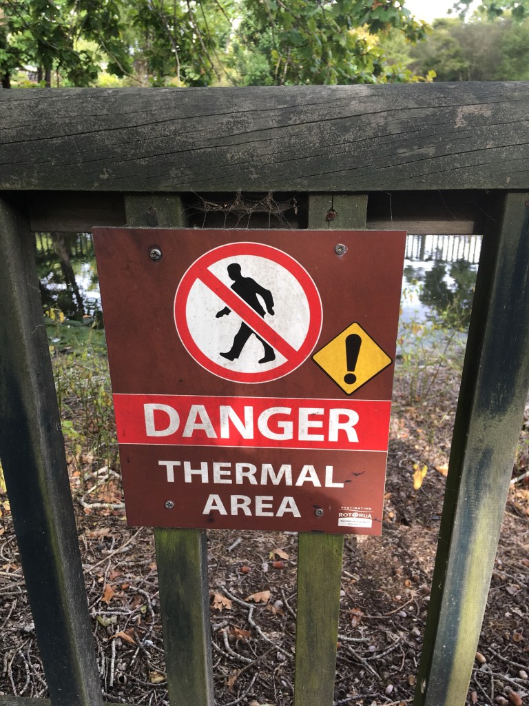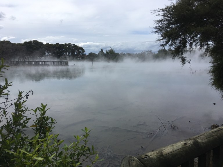 My only activity this day was the evening Mitai Maori haka and hangi dinner so I took the opportunity to walk into Rotorua and explore. The motel manager directed me to downtown through Kuirau Park a block away that is an active geothermal area. There’s a steaming geothermal lake and foot paths through many steaming pools and mud pits to some foot baths (heated geothermal pools cleaned, scrubbed and refilled each day). It’s so crazy that this local city park has all of this boiling and steaming spots in it and even the neighboring homes have fenced off spots in their yard where steam is rising up out of a hole. One of my shuttle drivers said home owners can tap into that heat for heating, cooling, drying clothes, whatever is needed.
