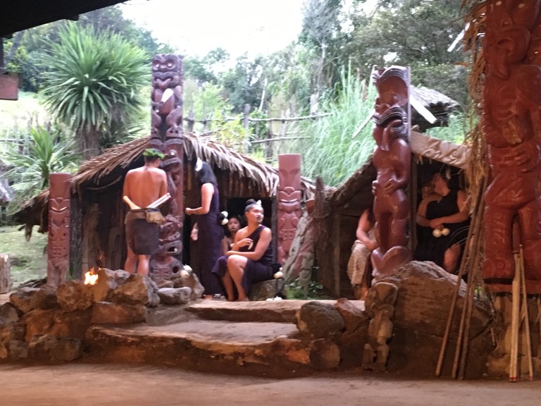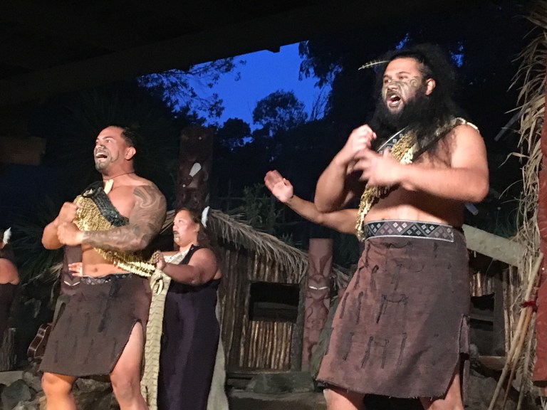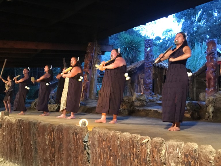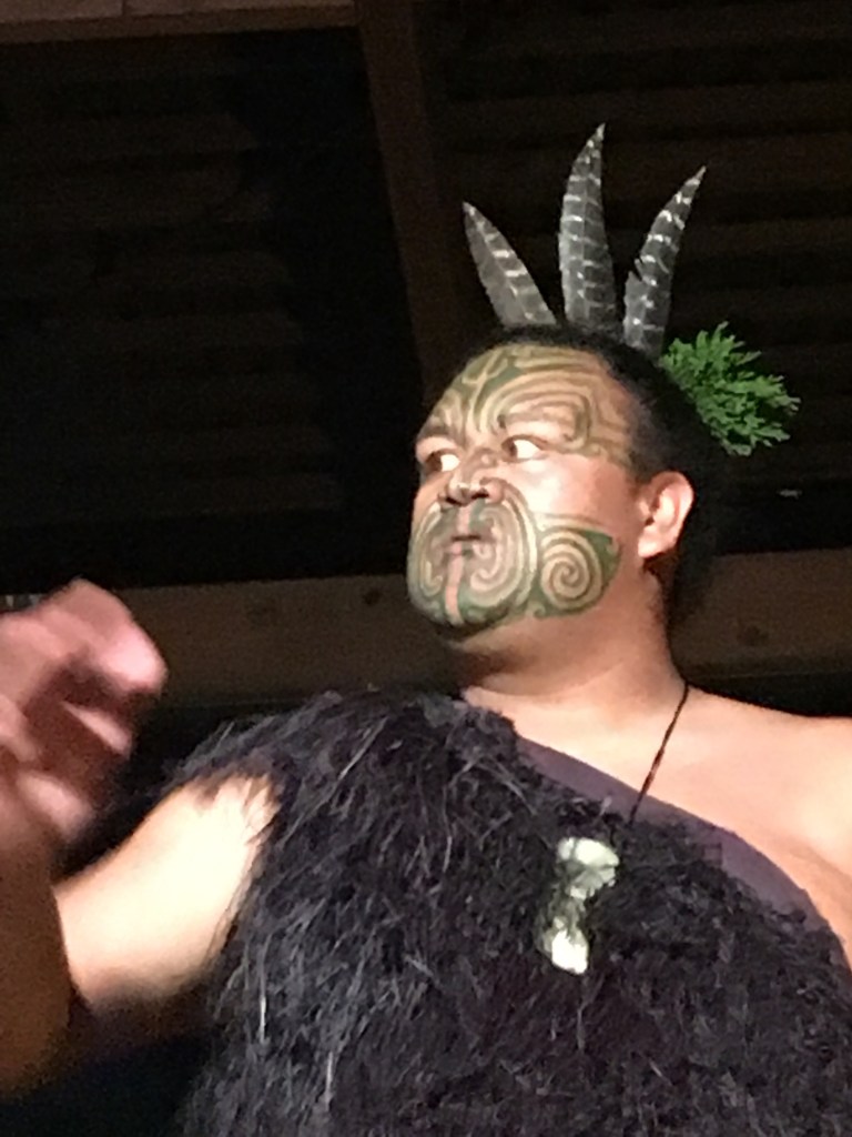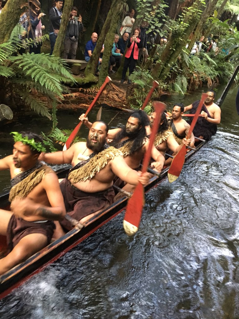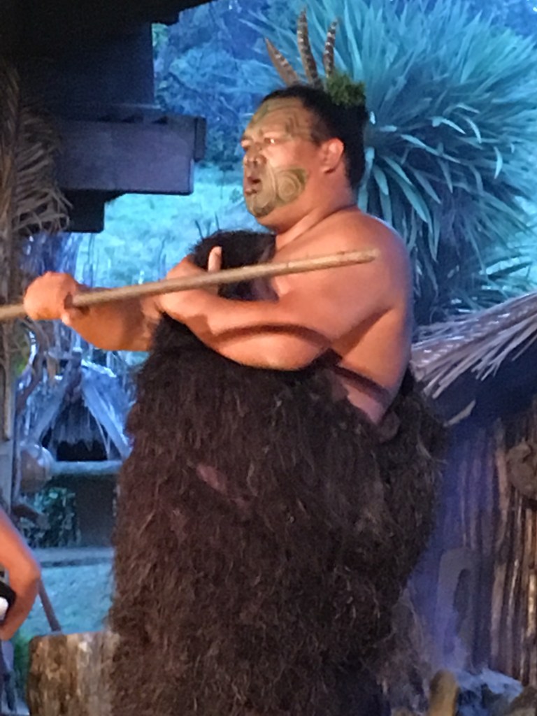 I needed to get back to the motel for my shuttle to the Mitai Maori Village performance and dinner (hangi). One of the local tribes, the Mitai family, has been at this place for hundreds of years, based mostly on the natural spring, the sacred Fairy Spring, that emerges from the ground. There are hundreds of natural springs in this area fed by the rain and aquifers. This cultural event is about 3 hours long with a tour, the arrival of warriors in a boat, the performance of the haka (war dance) and other songs and dances, then a traditionally cooked. For a few of us, I also went on a guided night tour to the Rainbow Springs Nature Park to see kiwi birds at their kiwi rehabilitation site (no pictures allowed).
