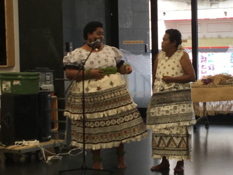 Karen arrived at the Auckland airport sometime around 7:45am on Monday the 19th. Following my directions, she met me at the Auckland Library around 9:30am. Hurray! Fighting a slight cold after weeks of organizing her student’s Ashland Shakespeare Festival field trip extravaganza and getting ready for this trip, I showed her to our studio apartment where she napped for a bit. I headed back to the library and was lucky enough to see a preview of the Pacifika celebration coming up the weekend of March 24 (we won’t be here). This was a presentation by some Fijians who explained their traditional clothing, items they make from flax and sang a traditional song.