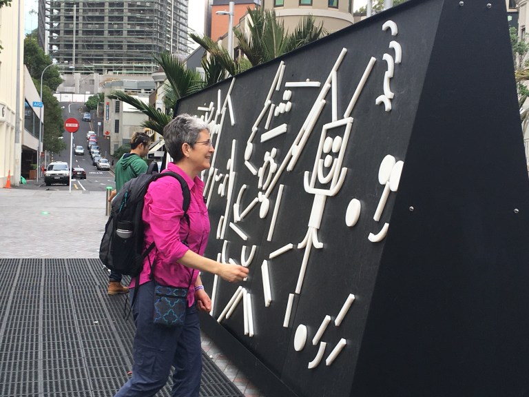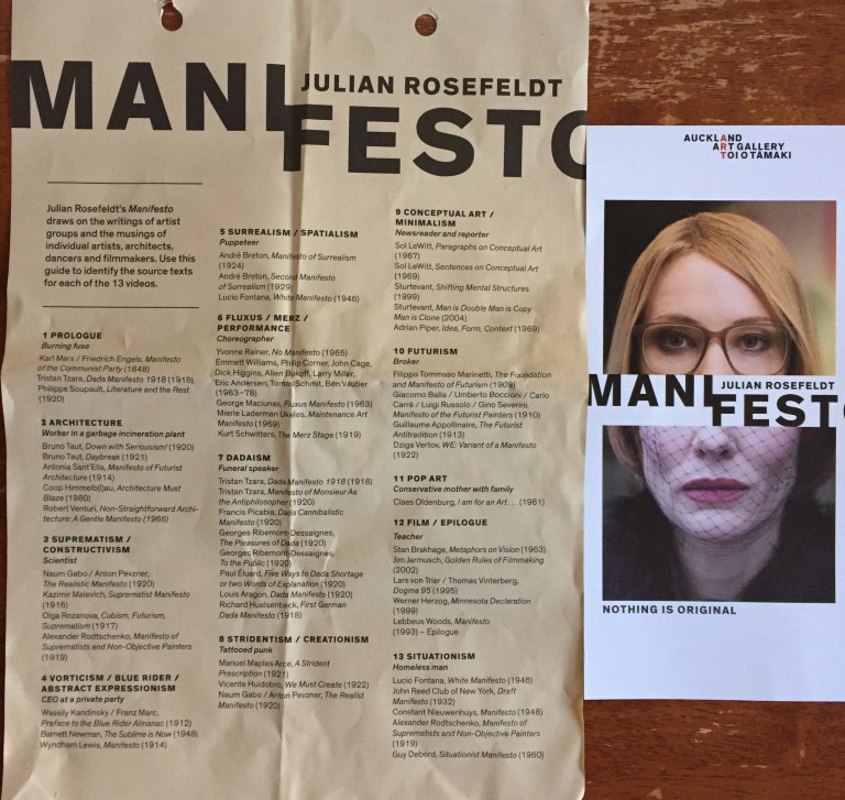 When Karen was up and about, we walked to a Chinese noodle shop for yummy noodles and then to the Auckland Art Gallery to see Julian Rosefeldt’s Manifesto which stars Cate Blanchett in 13 different roles, each on a different screen, including teacher, news anchor and reporter, homeless man, choreographer, puppeteer and CEO, among others. Each role is a different manifesto of various political or artistic movements, sometimes difficult to understand, intense, funny, unsettling. We finished the last one just as the museum was closing and the sound was turned off.