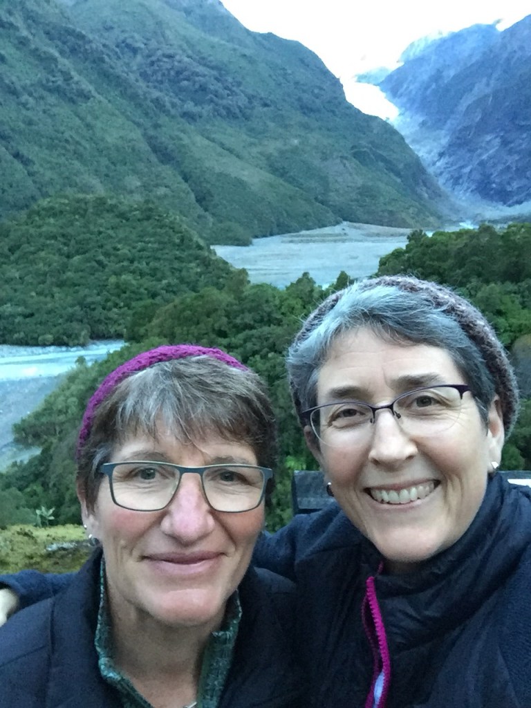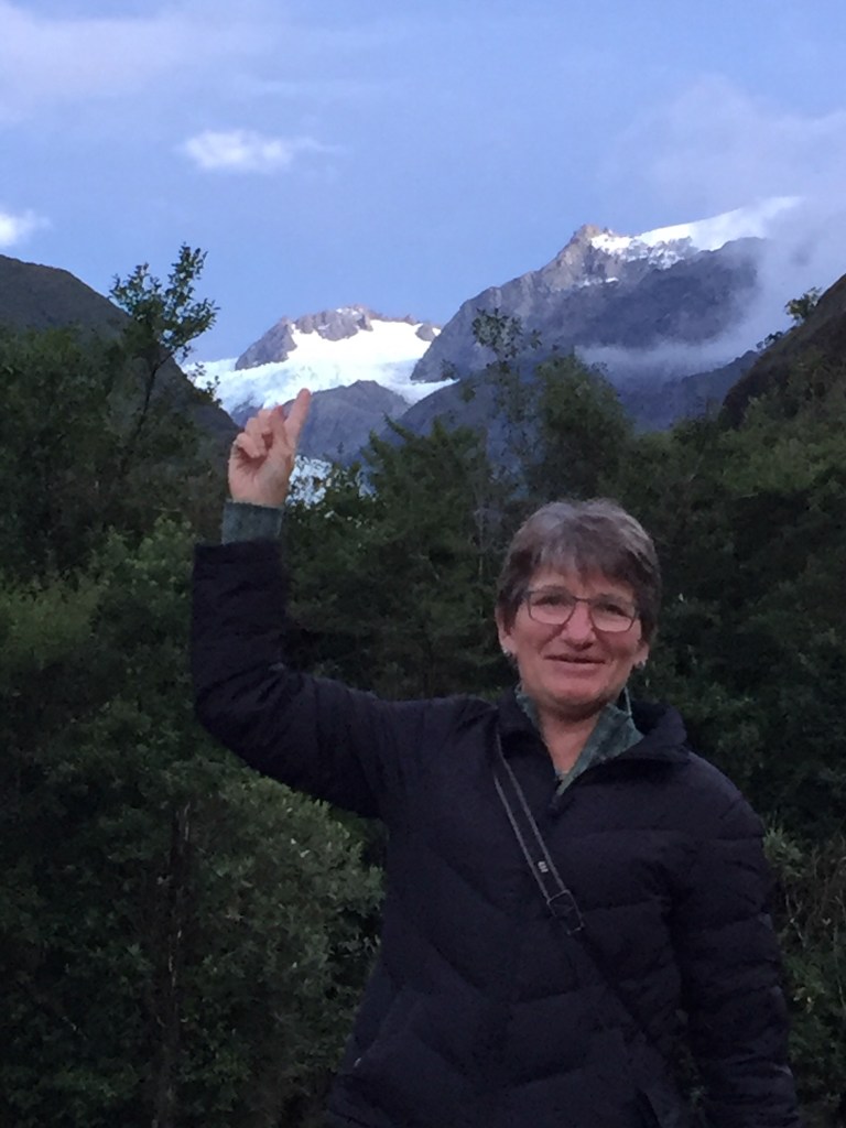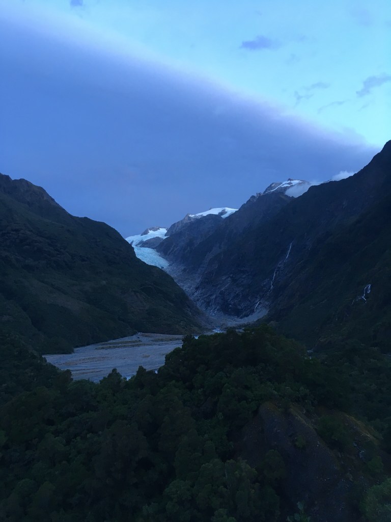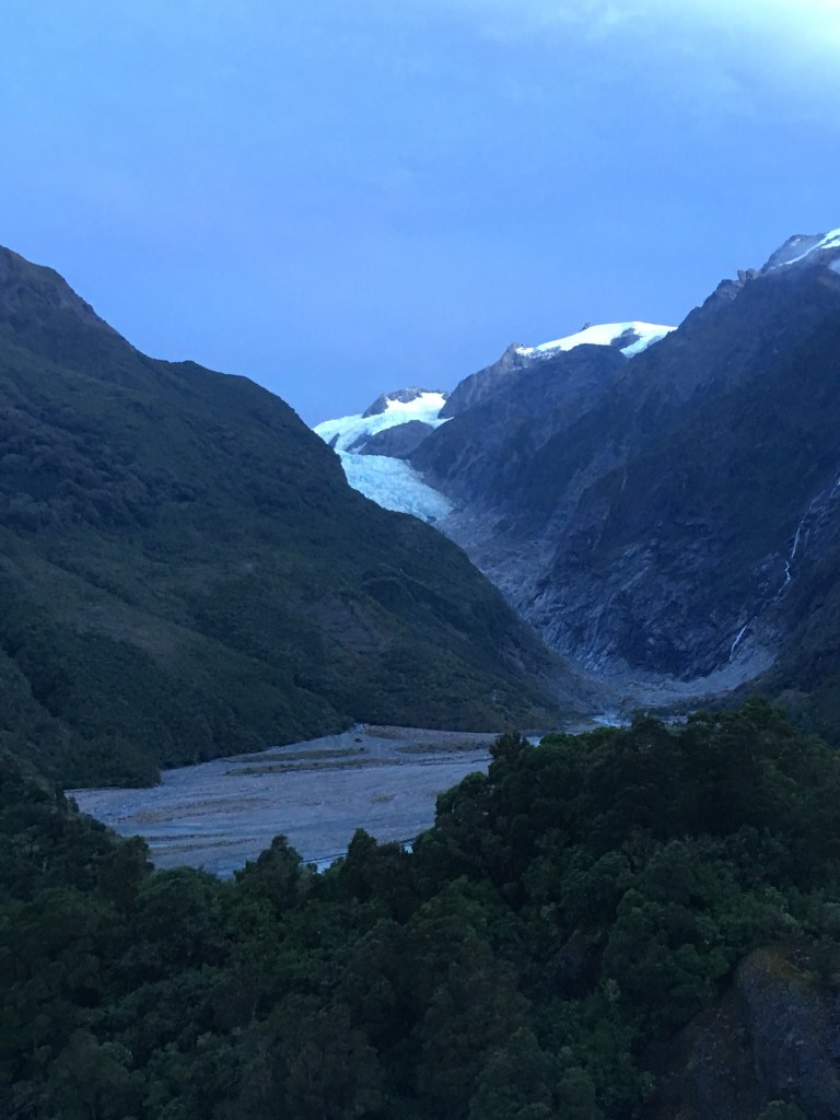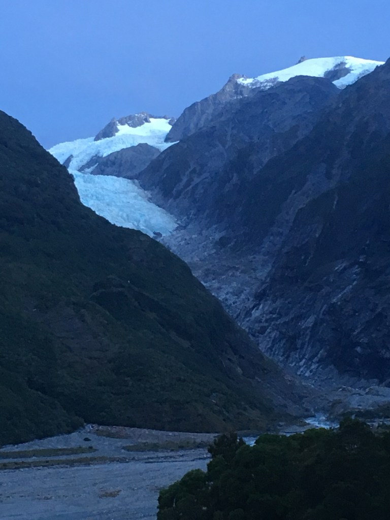 We made it to Franz Josef, the town, before dark and checked into our motel. The manager gave us a map and said that if we hurried we could probably get up to a certain viewpoint to see the glacier before dark. She hesitantly asked if we had a helicopter tour planned for the glacier the next day and was very relieved when we said no. The weather the next day was forecast for huge rain and likely all helicopter trips would be canceled. Our only chance to really see the glacier was the next hour. We dumped our luggage in our room and off we went to the Franz Josef Glacier Park where all the trail heads are. Our walk was a short 20 minute, fairly steep uphill to a place called Sentinel Rock. Good thing it was short because darkness was falling!