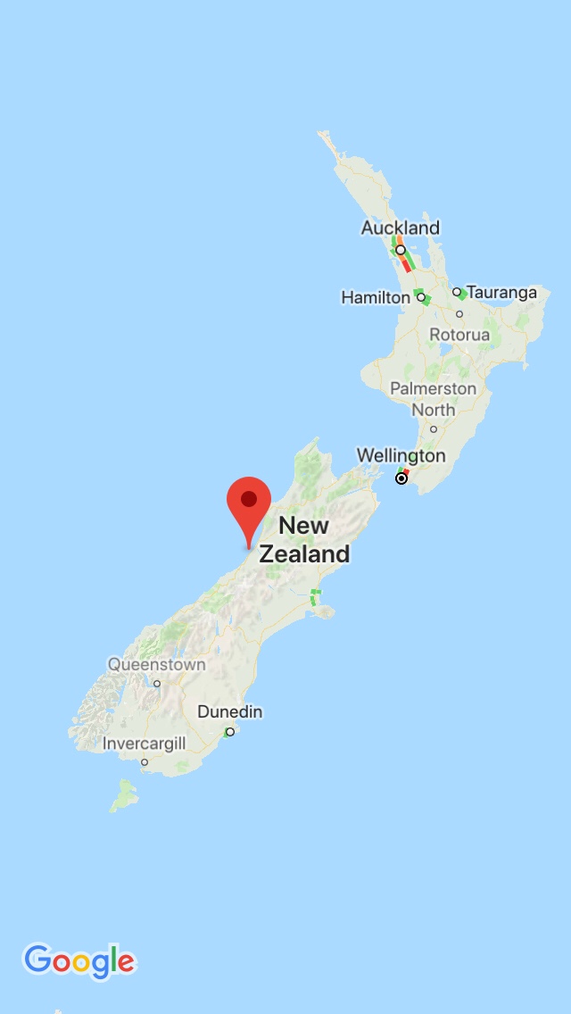 Let me add some maps so you have an idea of where we were on the South Island. The red pin is Hokitika.